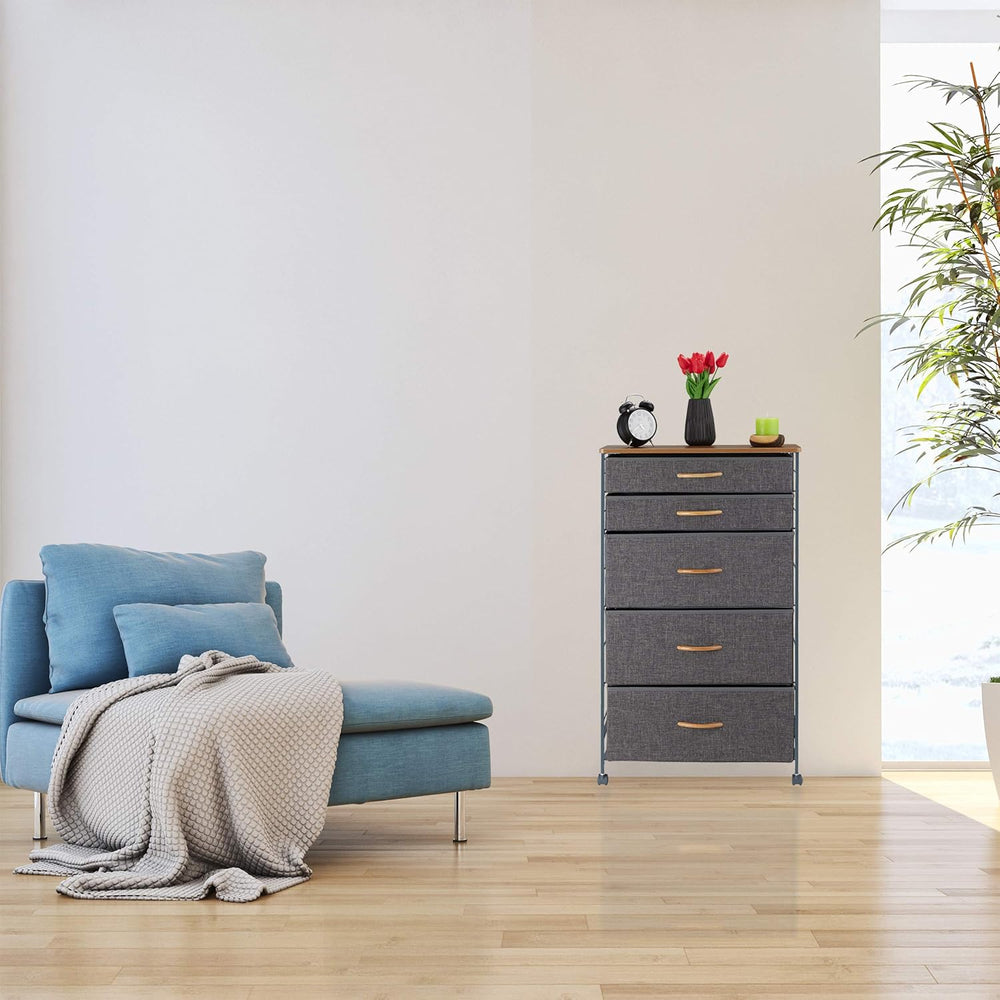 Relaxdays Schubladenschrank mit Rollen, 5 Stoff Schubladen, Deko Stoffschrank, Holzoptik, HBT 96,5 x