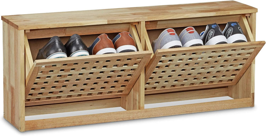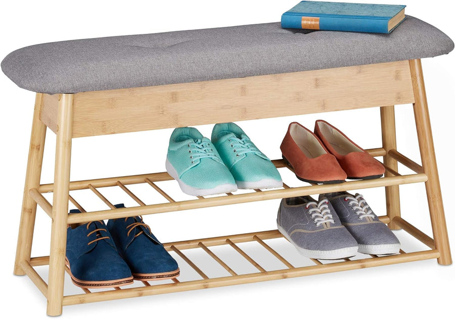Relaxdays Schuhbank f. 8 Paare, 2 Ablagen, klappbares Sitzpolster, 2 Fächer Stauraum, Bambus, HBT 48