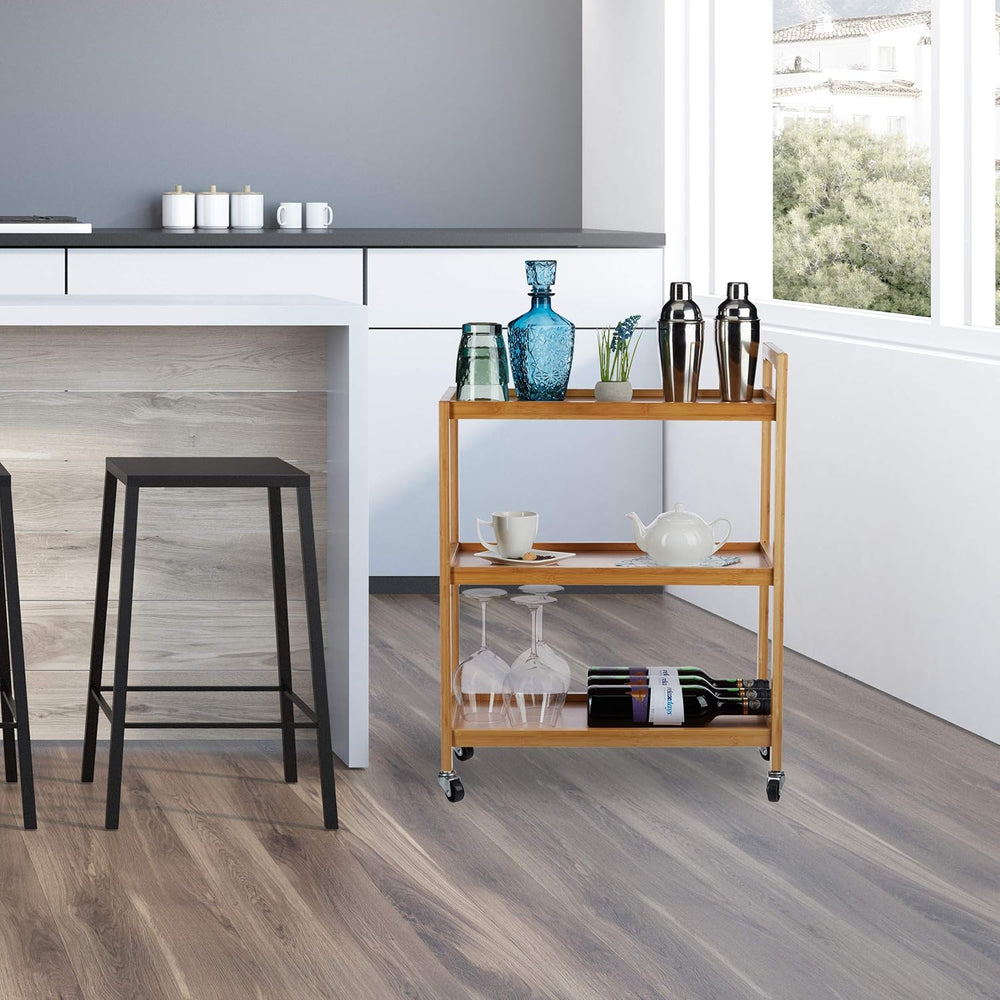 Relaxdays Servierwagen Bambus, 3 Ablagen, natürliche Optik, 360° drehbare Rollen, Rollwagen, HxBxT: