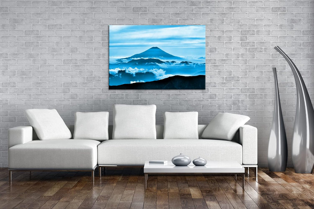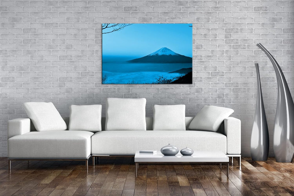 deyoli Fuji Vulkan in Japan Format 80x60 Effekt: Monocrome Blau als Leinwandbild, Motiv fertig gerah