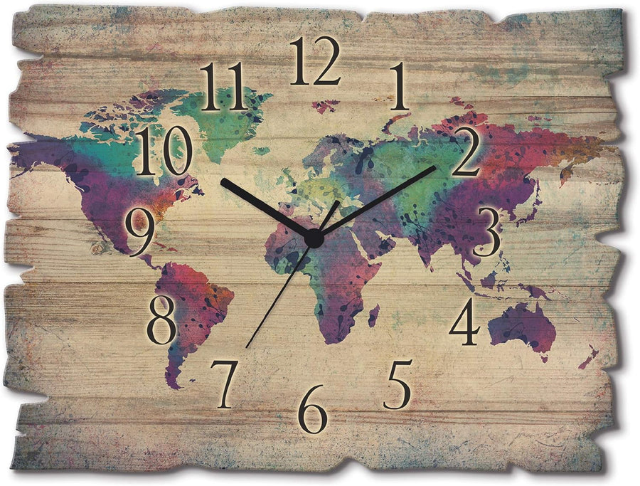 ARTLAND Wanduhr ohne Tickgeräusche aus Holz Quarz Uhr lautlos 40x30 cm Rechteckig Weltkarte Landkart