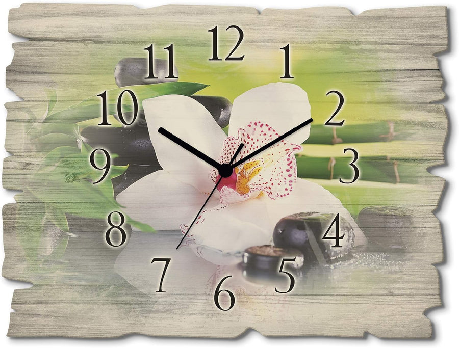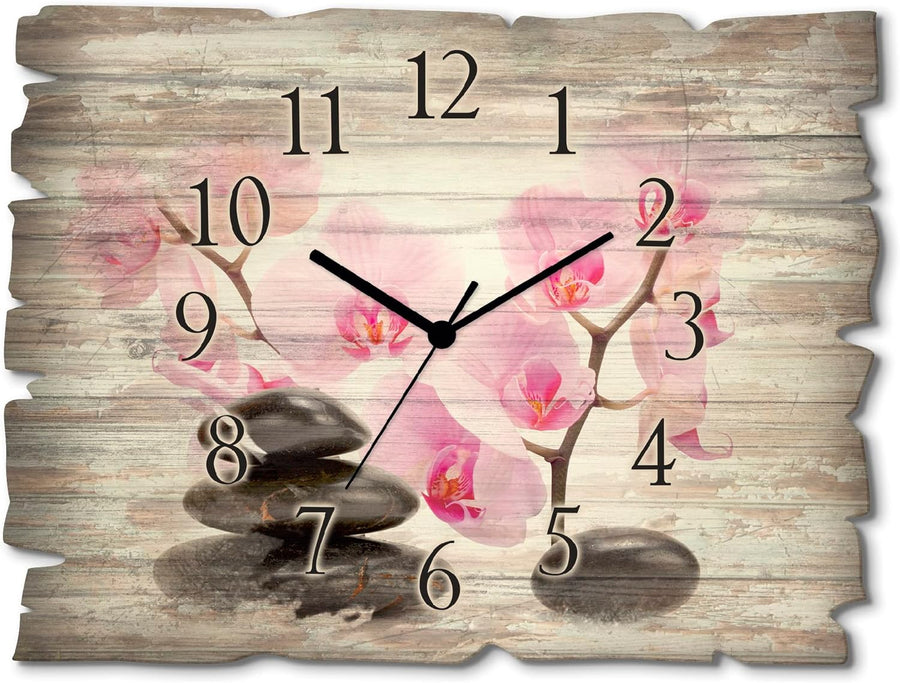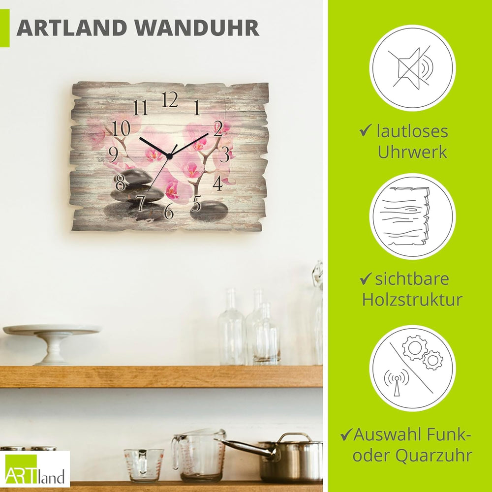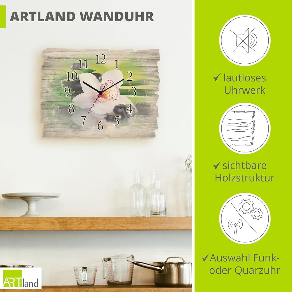 ARTLAND Wanduhr ohne Tickgeräusche aus Holz Funkuhr 40x30 cm Rechteckig Lautlos Orchidee Zen Pflanze