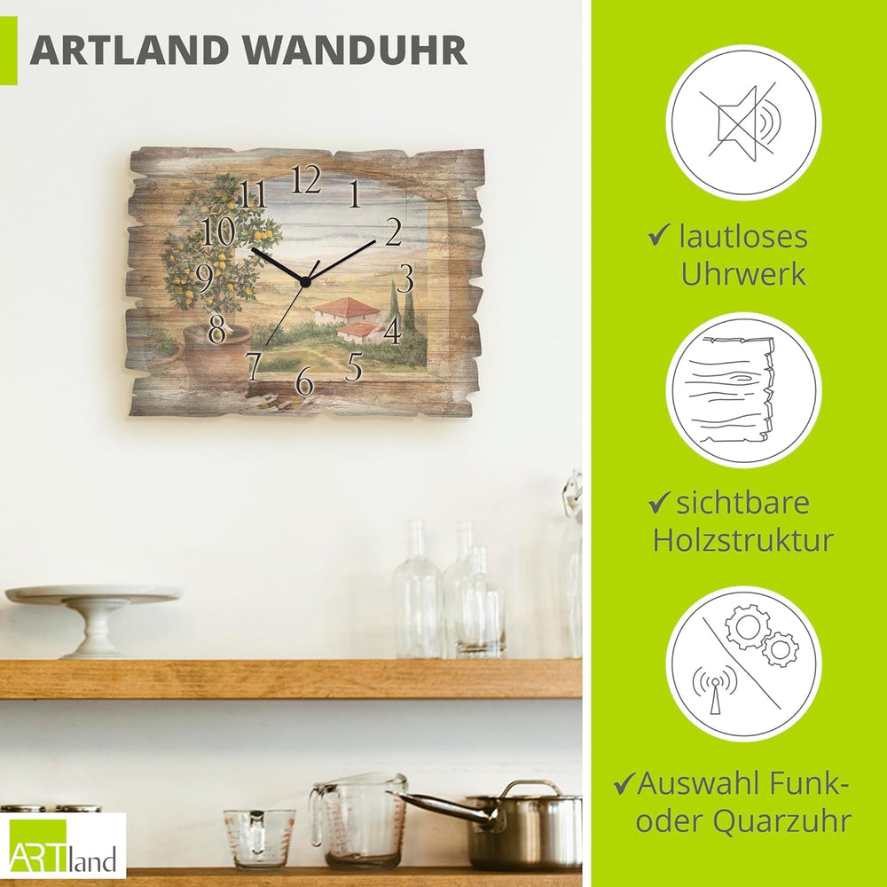ARTLAND Wanduhr ohne Tickgeräusche aus Holz Quarz Uhr lautlos 40x30 cm Rechteckig Küche Landschaft N