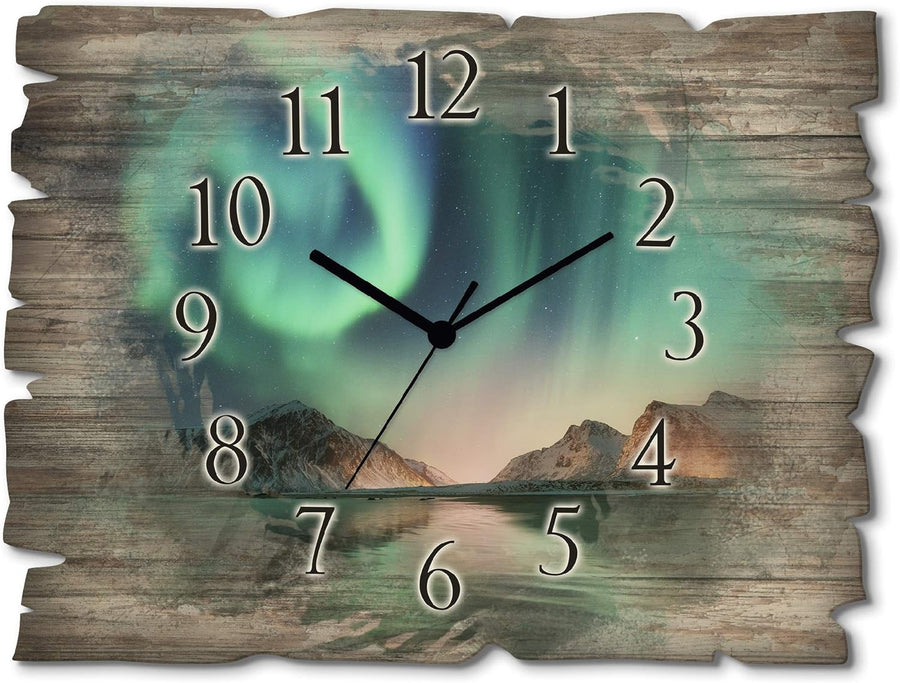 ARTLAND Wanduhr ohne Tickgeräusche aus Holz Quarzuhr 40x30 cm Rechteckig Lautlos Nordlicht Polarlich