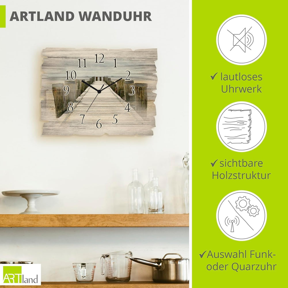 ARTLAND Wanduhr ohne Tickgeräusche aus Holz Funkuhr 40x30 cm Rechteckig Lautlos Strand Meer Steg Wat