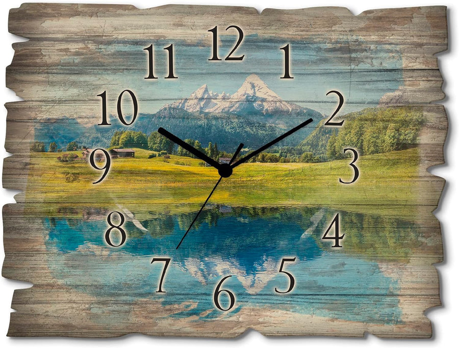 ARTLAND Wanduhr ohne Tickgeräusche aus Holz Funkuhr 40x30 cm Rechteckig Lautlos Natur Landschaft See