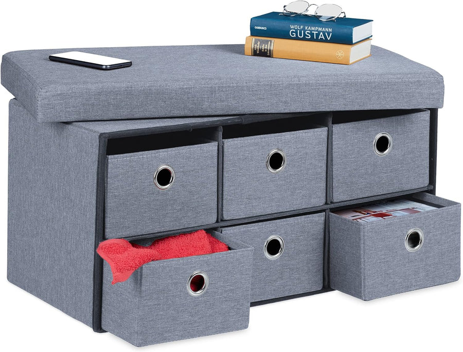 Relaxdays Sitzbank, Stauraum in 6 Schubladen, bequemes Sitzpolster, Faltbare Sitzkommode, HxBxT: 39