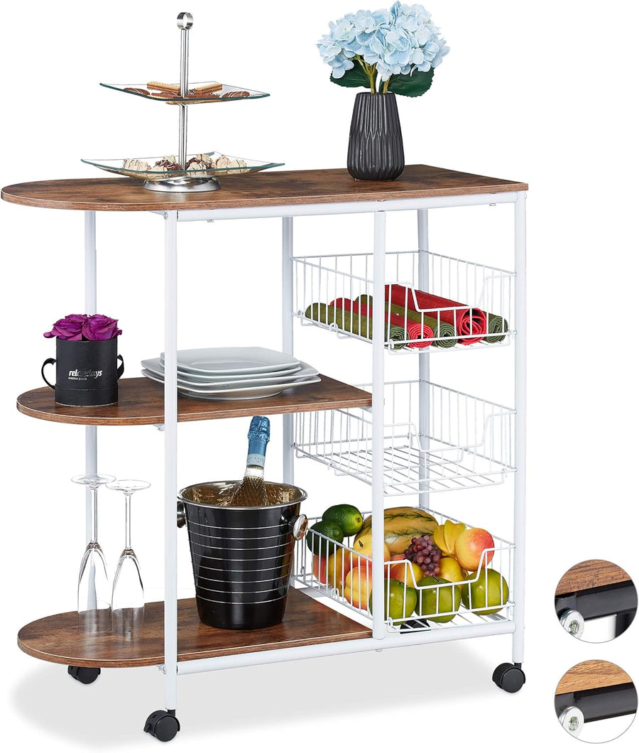 Relaxdays Servierwagen, Küchenwagen mit 3 Ablagen & 3 Körben, Industrial, Metall & MDF, HBT: 84 x 83