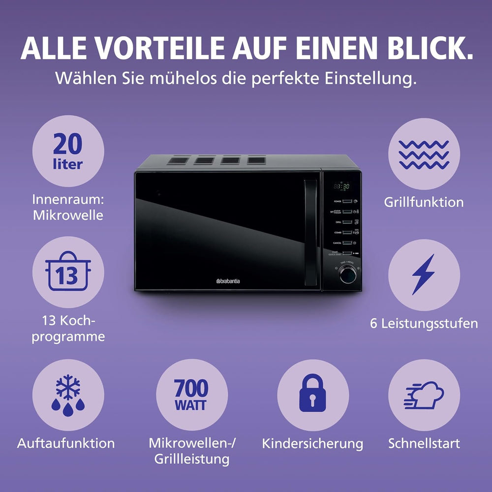 Brabantia Mikrowelle mit Grillfunktion, 20 Liter, 700W, Freistehend, 13 Automatikprogramme, 6 Leistu