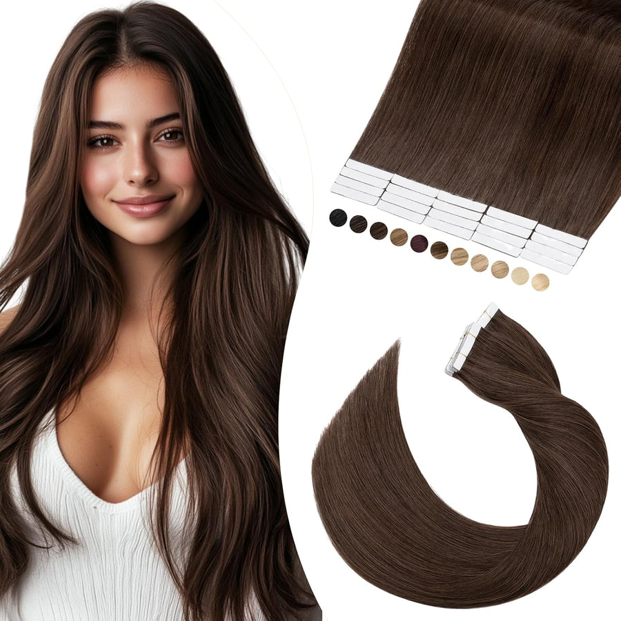 Elailite Tape Extensions Echthaar #2 Dunkelbraun, 10 Stück Unsichtbar Kleber Haarverlängerungen 20g,