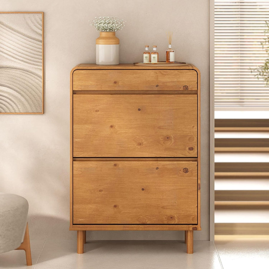 Schuhkipper NAEL mit 2 Klappen und Schublade, Eiche farben – schmaler Schuhschrank aus massivem Kief