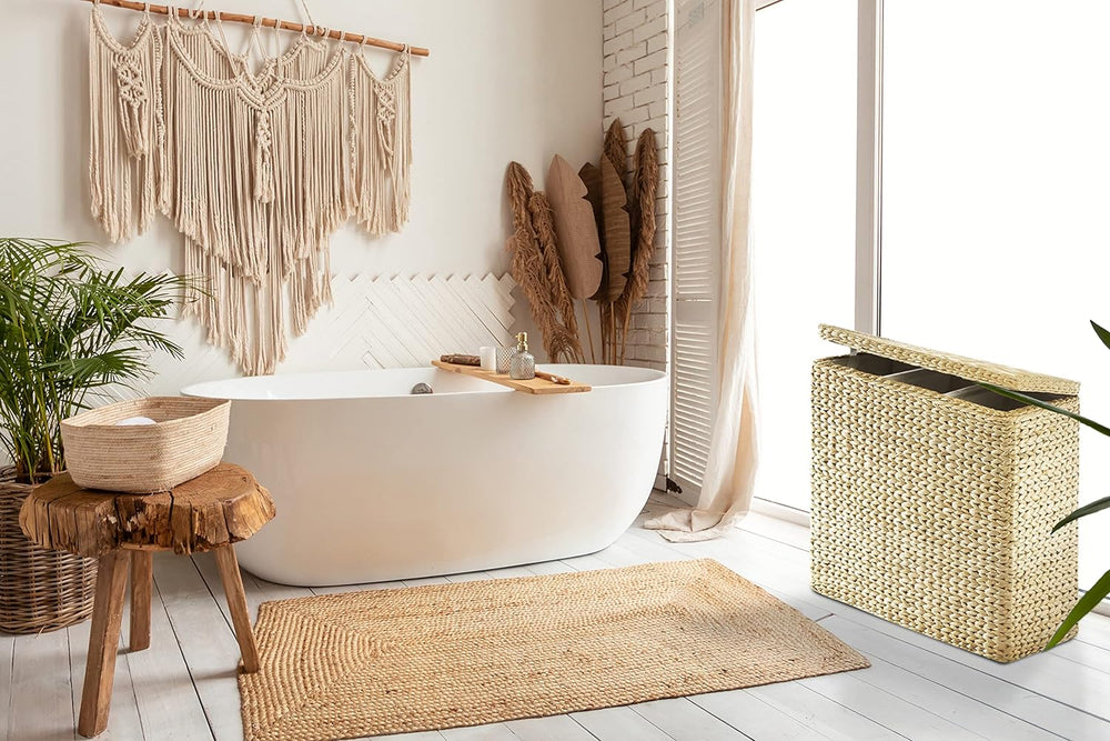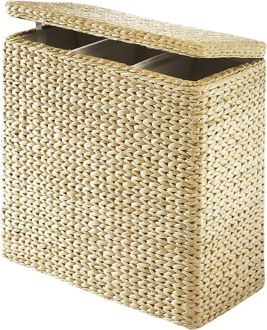 Kobolo Praktischer Wäschesortierer mit 3 Fächern aus Binse mit Textilinnenfutter Natur
