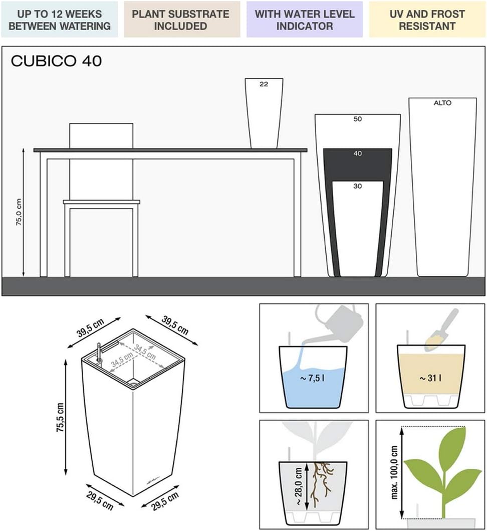 LECHUZA CUBICO Premium 40 anthrazit metallic 18194, 39.5x39.5x75.5 cm 39.5x39.5x75.5 cm Anthrazit Me