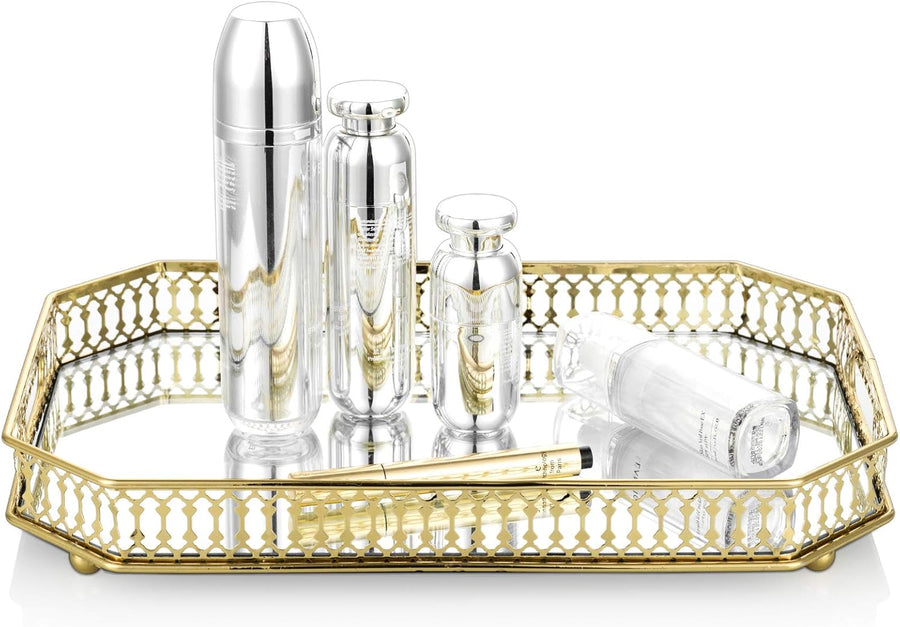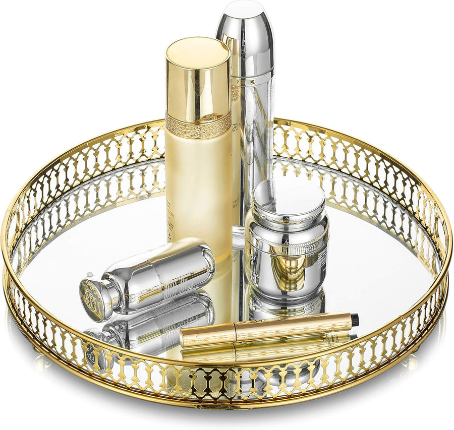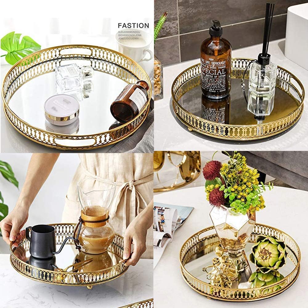 NUPTIO Parfüm-Tablett verspiegelt goldfarben: Dekoratives Tischtablett Glas-Organizer Metall Rund ve