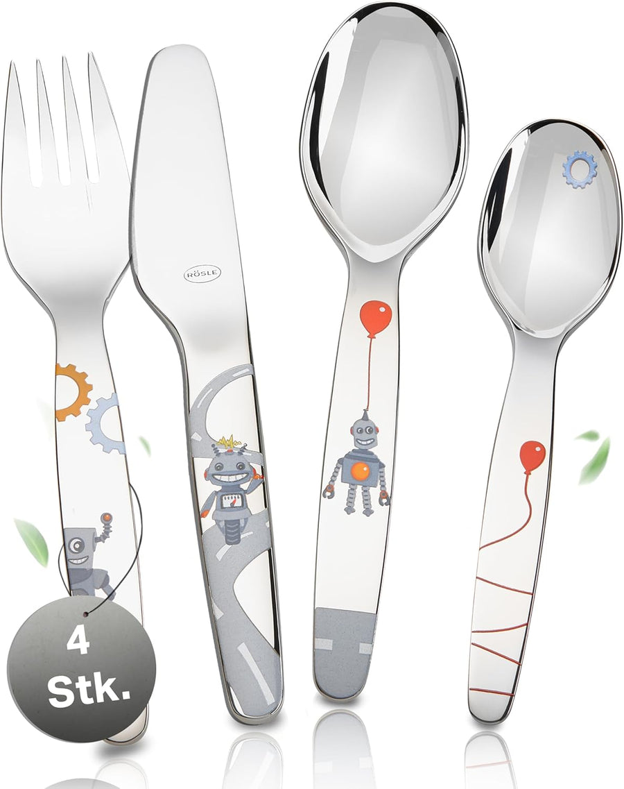 RÖSLE Kinderbesteck "Kleiner Roboter", 4-teilig, ab 3 Jahren, Edelstahl 18/10, Spülmaschinengeeignet