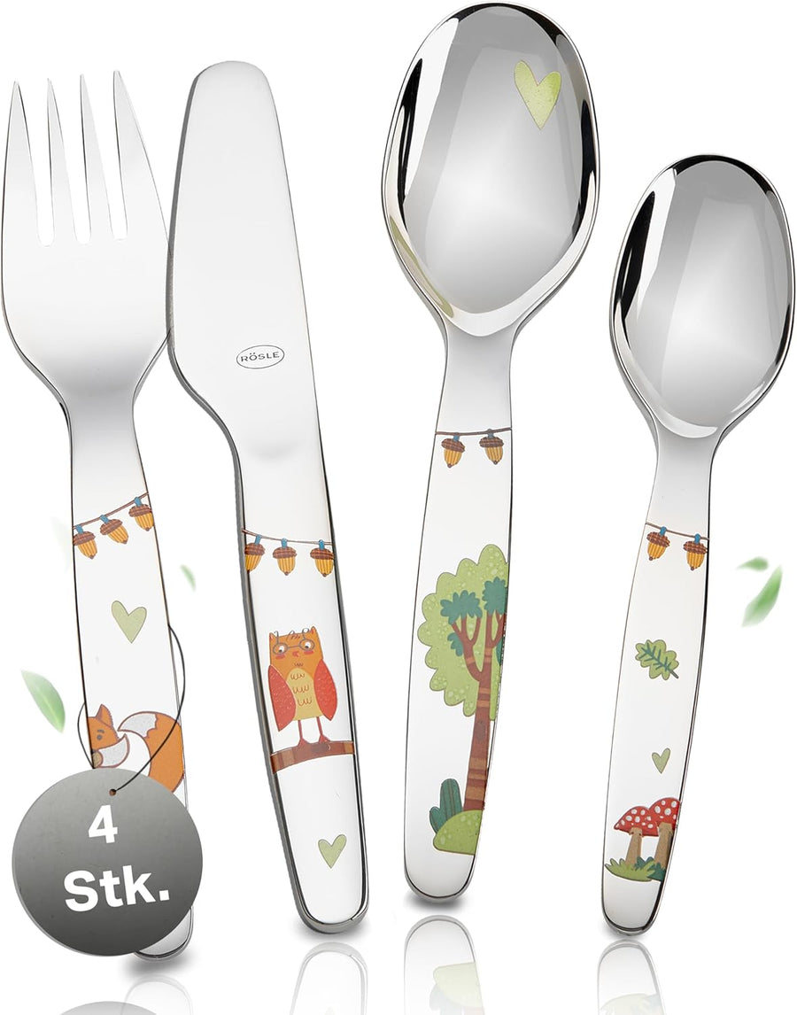 RÖSLE Kinderbesteck "Waldfreunde", 4-teilig, ab 3 Jahren, Edelstahl 18/10, Spülmaschinengeeignet, Wa