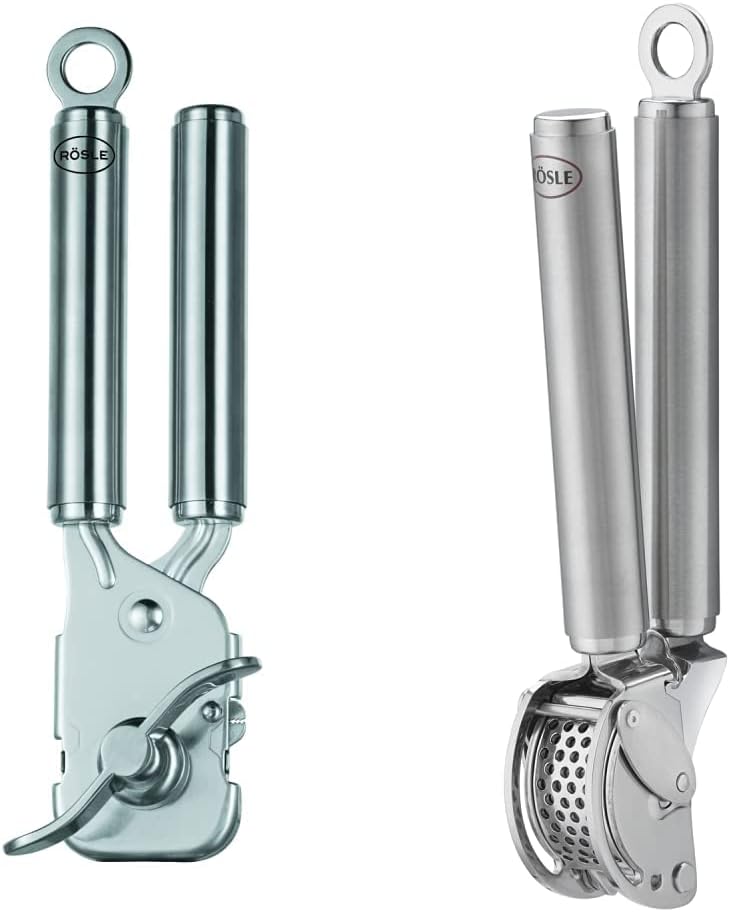 RÖSLE Knoblauchpresse mit Abstreifer, Spülmaschinengeeignet & Zangen-Dosenöffner, Hochwertiger Dosen