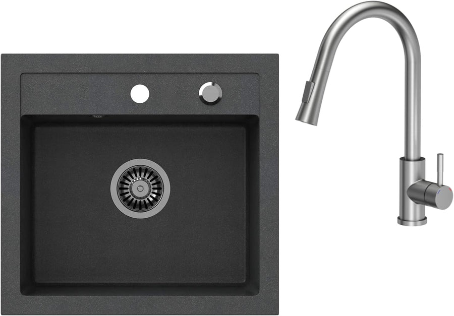 VBChome Spülbecken mit Armatur 50 x 47 cm Schwarz Granit Spüle Einzelbecken Küche Einbauspüle Verbun
