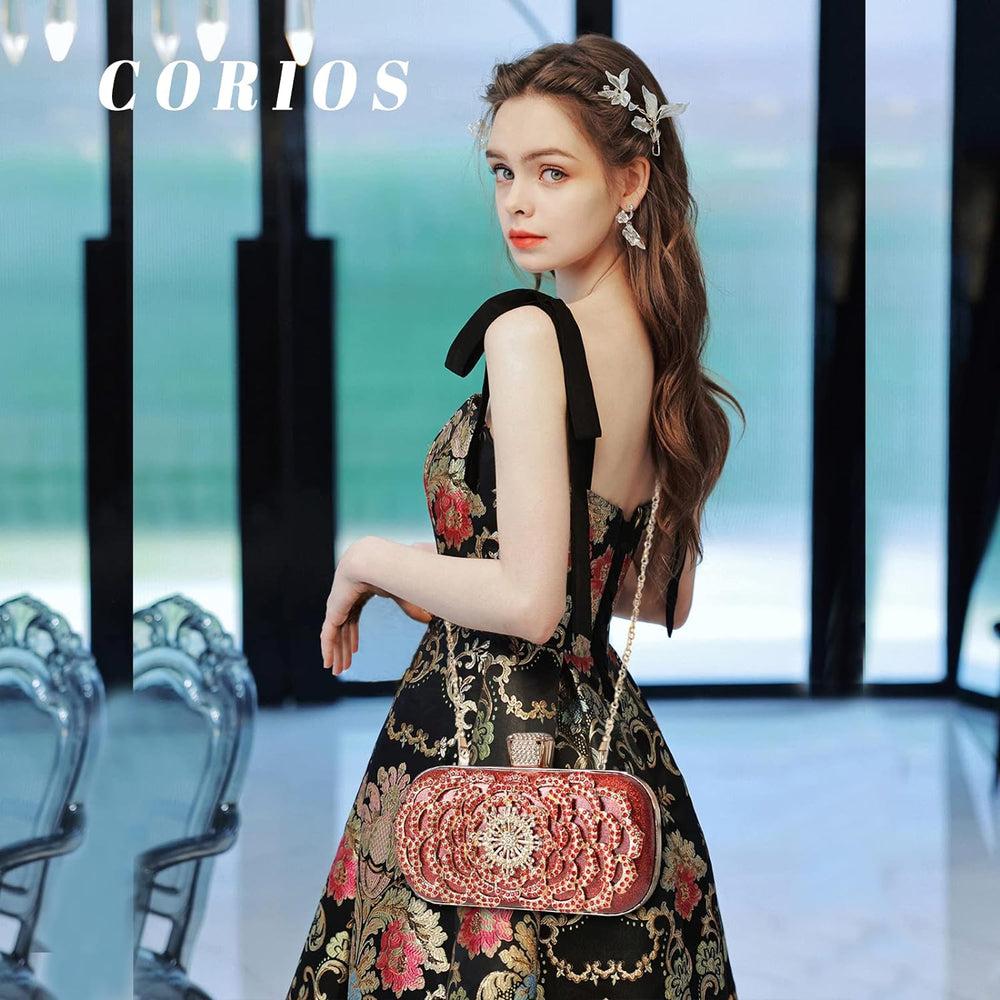 CORIOS Damen Elegante Abendtasche Blumen Clutch Tasche Handtasche mit Kette Kiss Lock Mini Rose Schu
