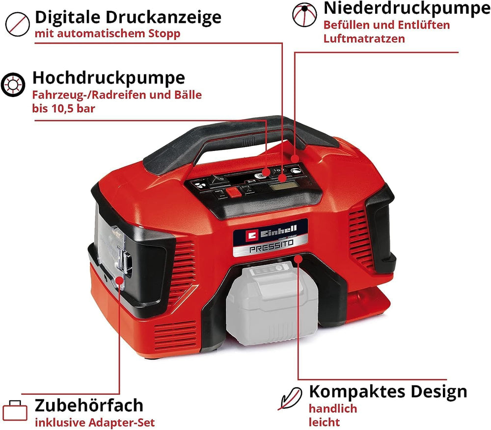 Einhell Akku-Kompressor PRESSITO 18/21 Power X-Change (Li-Ion, 18V, Hoch- u. Niederdruckpumpe, digit