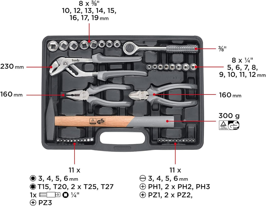 kwb Werkzeugkoffer aus robustem Hartkunststoff inkl. 63-tlg. hochwertigem Werkzeug-Set als solide Gr