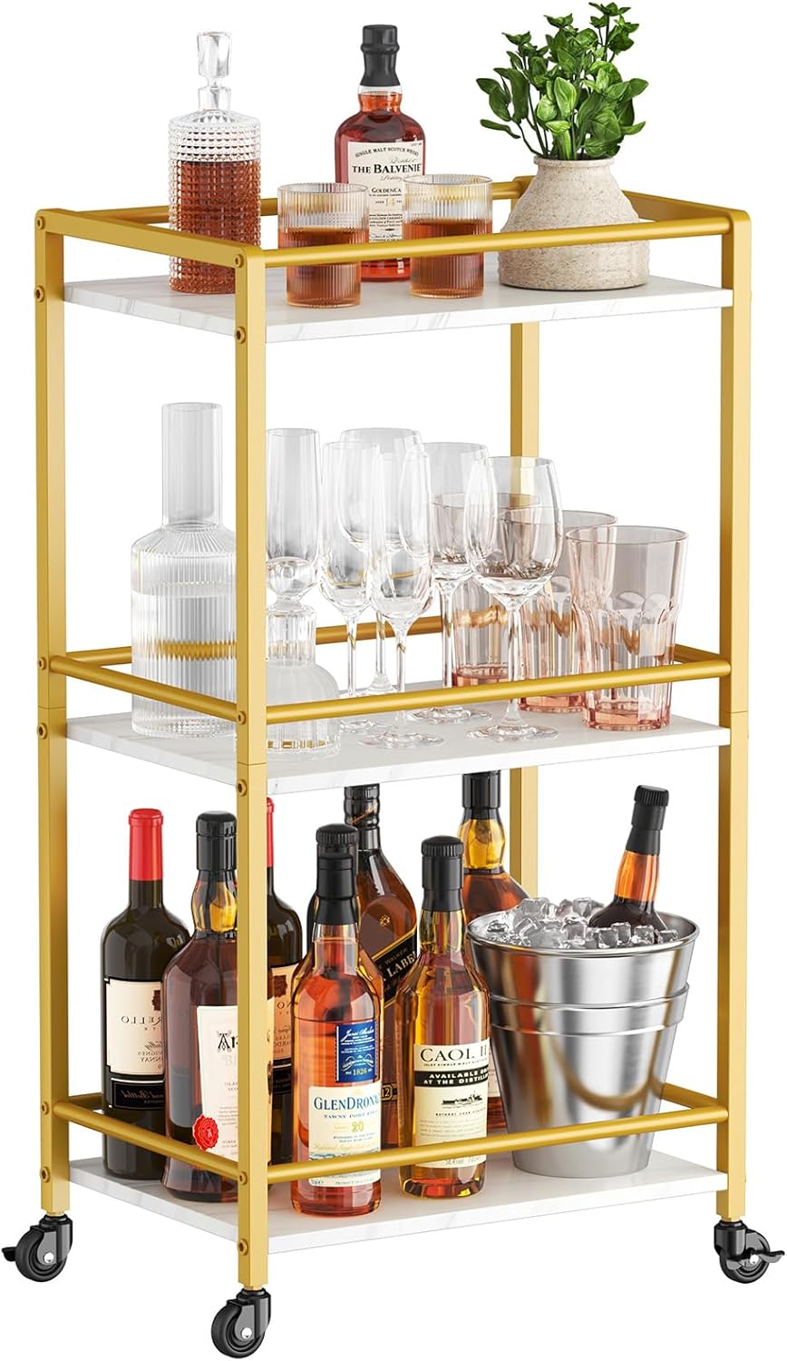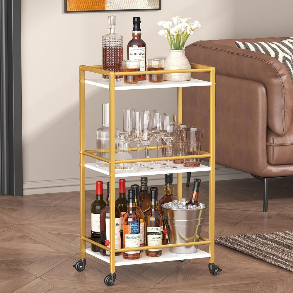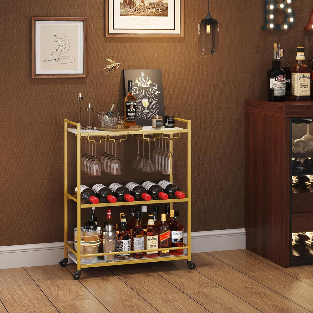 Lifewit Servierwagen, 3-stöckiger Barwagen mit blockierbaren Rädern, Weinregal und Glashaltern, Küch