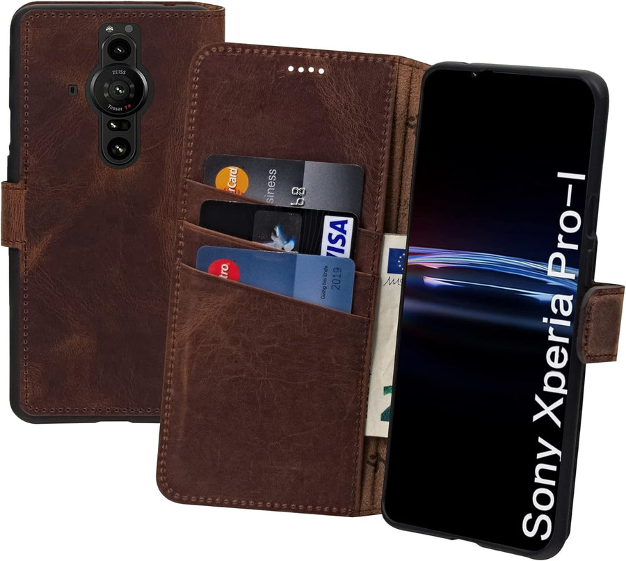 Suncase Book-Style Hülle kompatibel mit Sony Xperia Pro-I Leder Tasche (Slim-Fit) Lederhülle Handyta