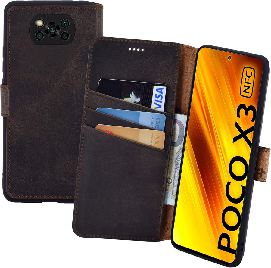 Suncase Book-Style Hülle kompatibel mit Xiaomi Poco X3 NFC Leder Tasche (Slim-Fit) Lederhülle Handyt