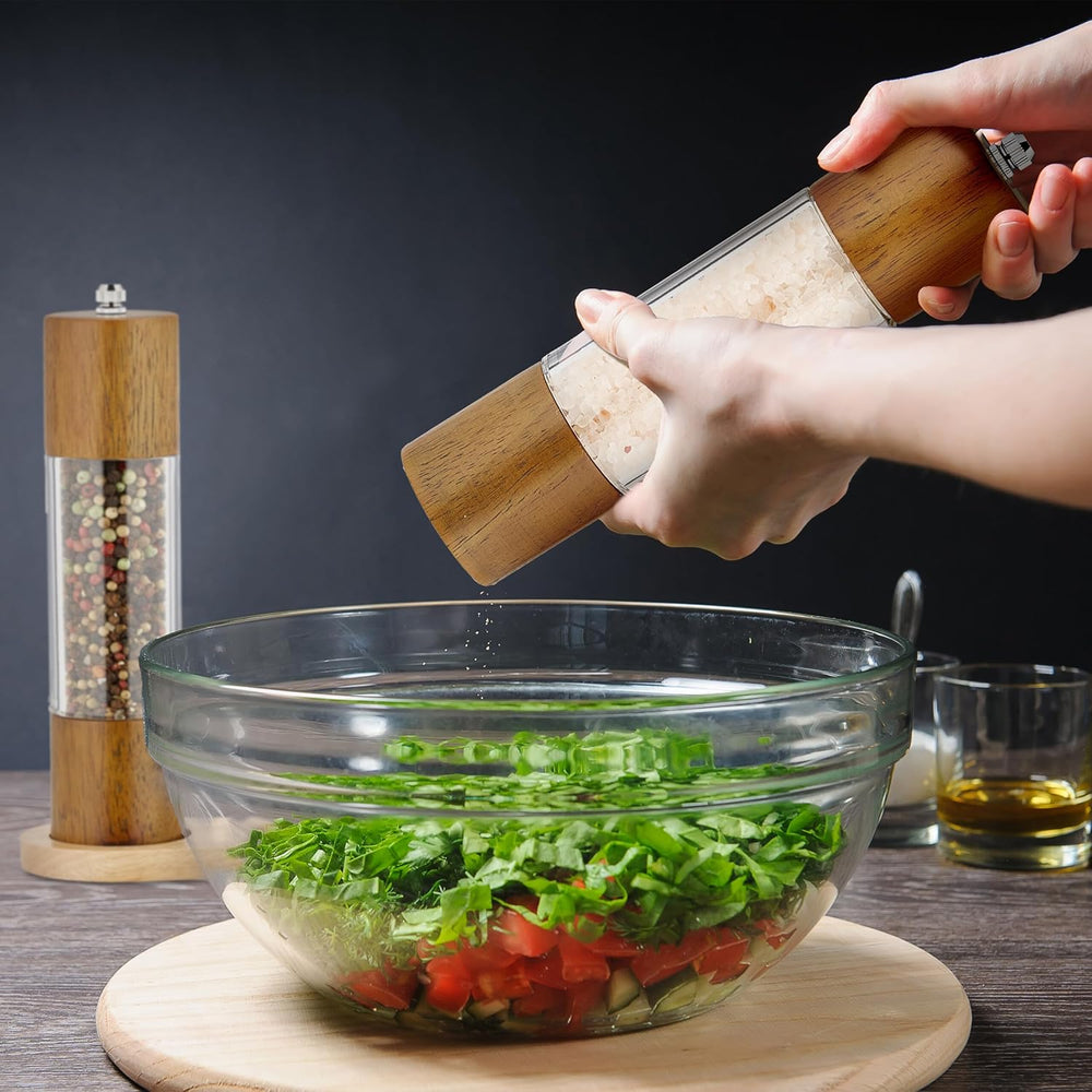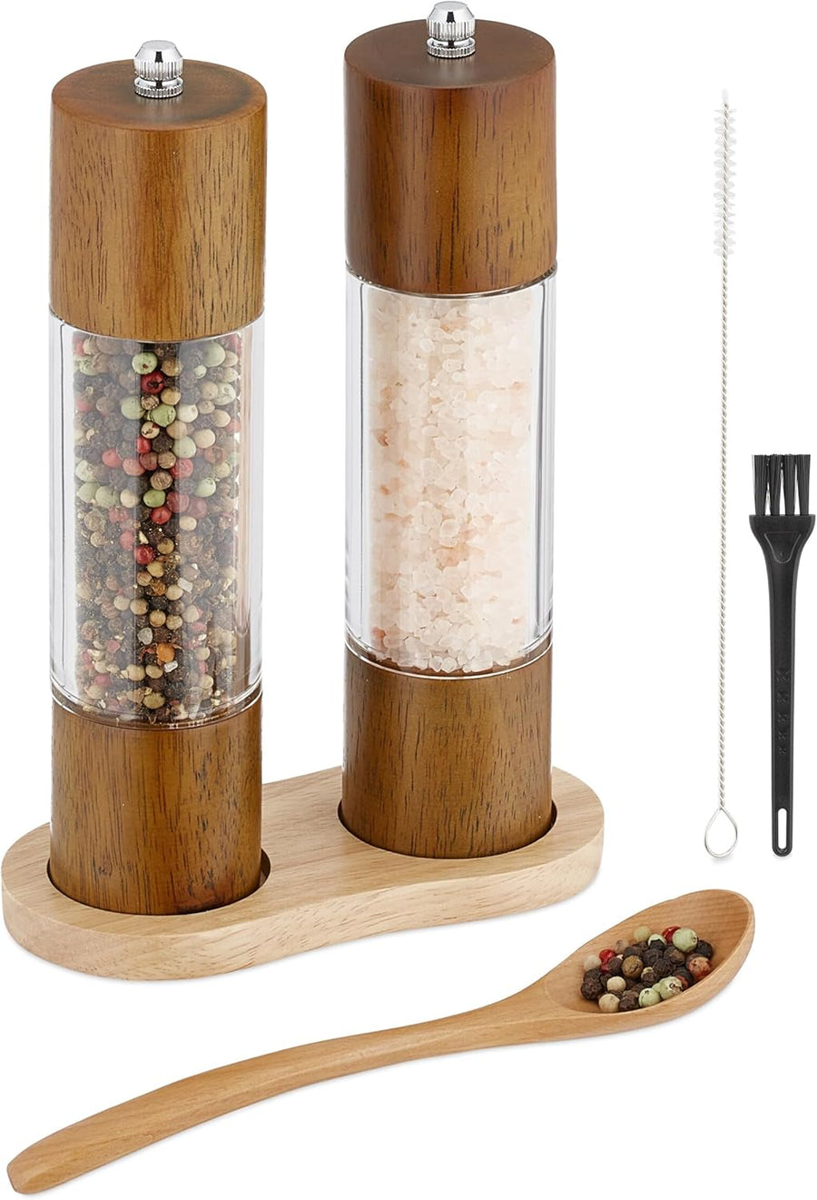 Relaxdays Salz-und Pfeffermühle 2er Set, Untersetzer, Keramikmahlwerk, Holz & Acryl, manuelle Mühlen