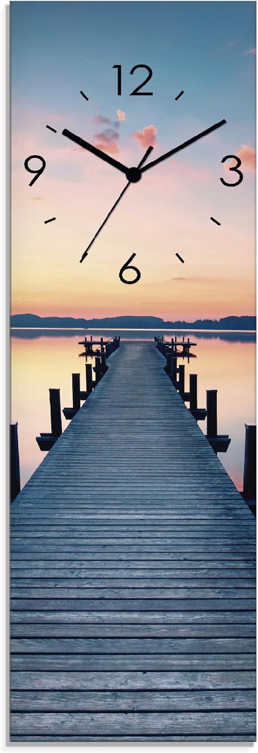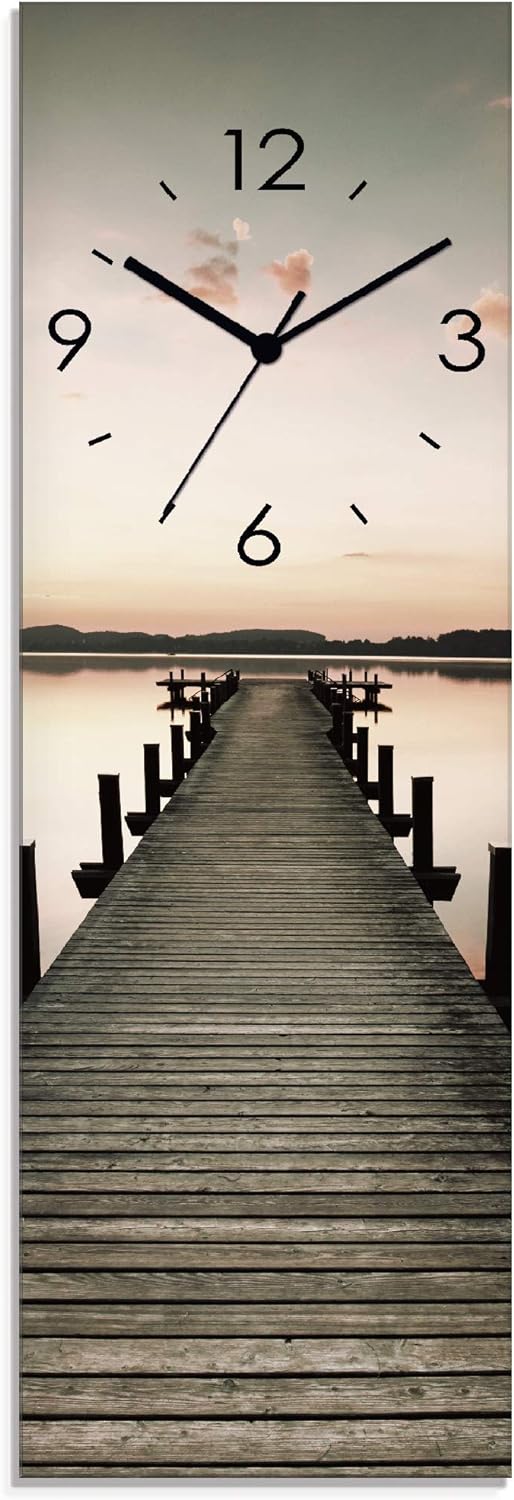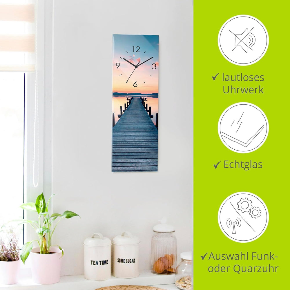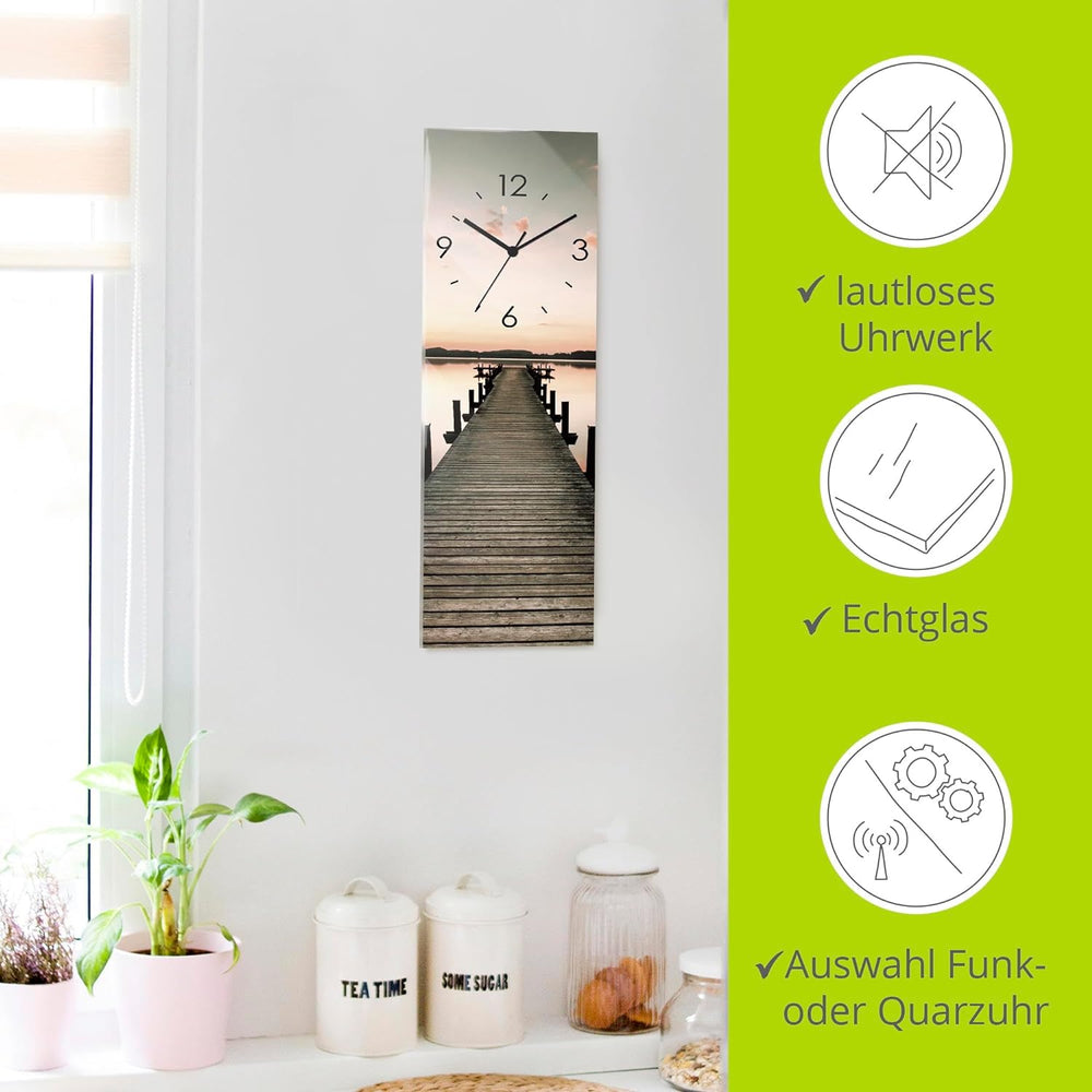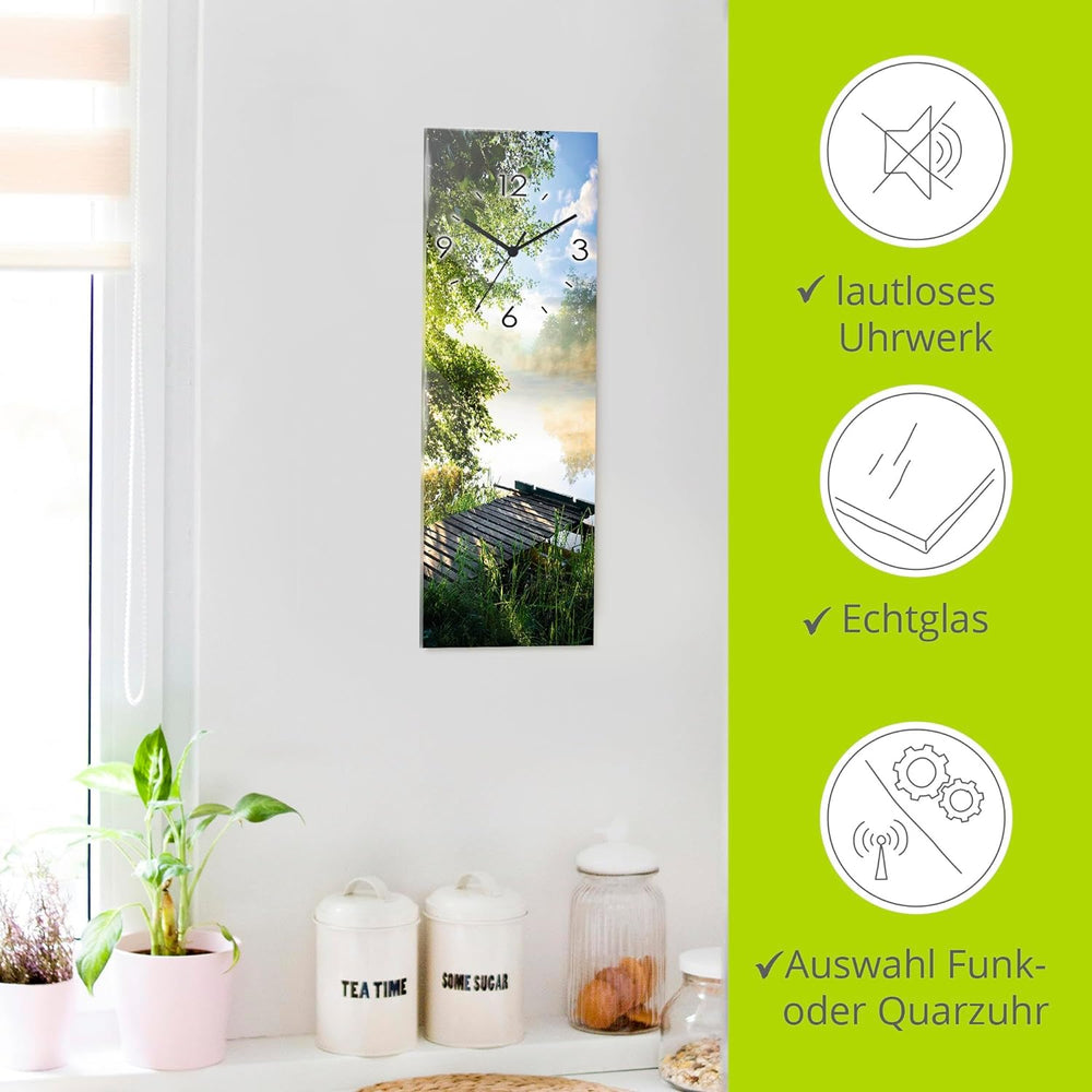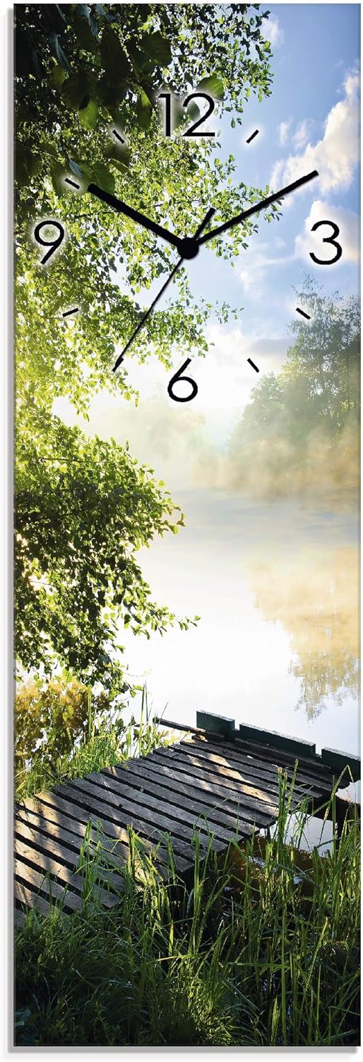 ARTLAND Wanduhr ohne Tickgeräusche Glas Quarzuhr 20x60 cm Rechteckig Lautlos Natur See Steg Sonnenau