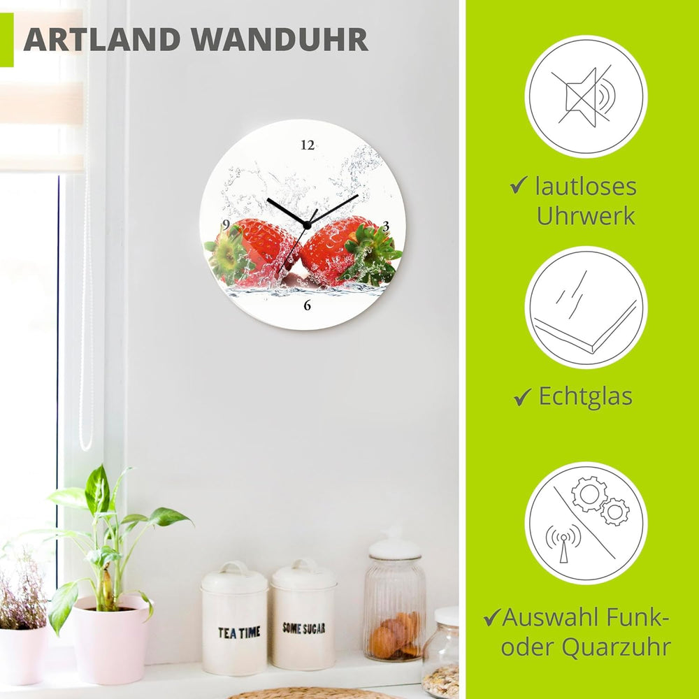 ARTLAND Wanduhr ohne Tickgeräusche Glas Funkuhr Ø 30 cm Rund Lautlos Obst Früchte Erdbeere im Wasser