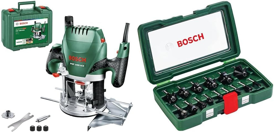Bosch Oberfräse POF 1400 ACE (3 x Spannzange, Fräser, Parallelanschlag, Absaugadapter, Koffer) + 15t