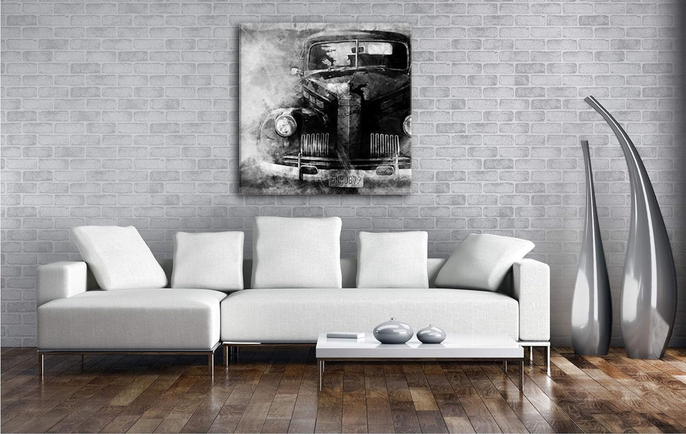 deyoli gezeichneter Alter Oldtimer Format: 70x70 Effekt: Schwarz&Weiss als Leinwandbild, Motiv ferti