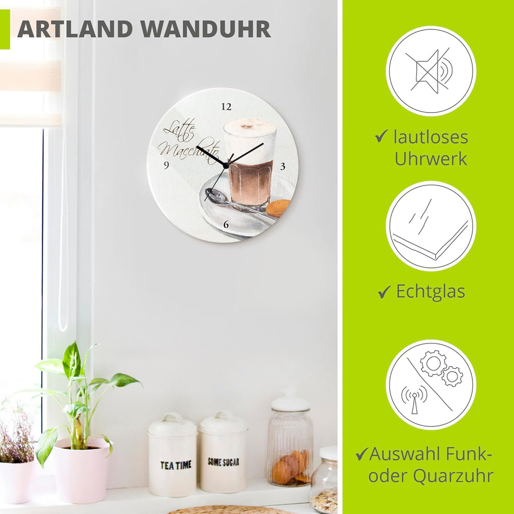 ARTLAND Wanduhr ohne Tickgeräusche Glas Quarzuhr Ø 30 cm Rund Lautlos Kaffee Coffee Cafe Latte Macch