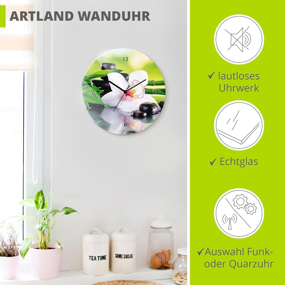 ARTLAND Wanduhr ohne Tickgeräusche Glas Quarzuhr Ø 30 cm Rund Lautlos Orchidee Zen Pflanze Spa Stein