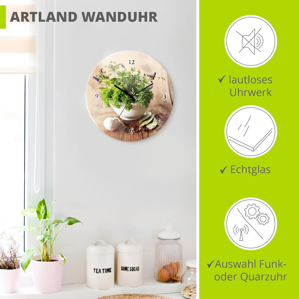ARTLAND Wanduhr ohne Tickgeräusche Glas Quarzuhr Ø 30 cm Rund Lautlos Kräuter Gewürze Olivenöl Holzo