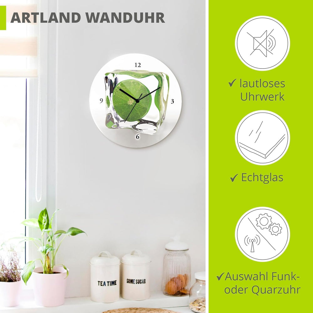 ARTLAND Wanduhr ohne Tickgeräusche Glas Quarzuhr Ø 30 cm Rund Lautlos Obst Früchte Limette im Eiswür