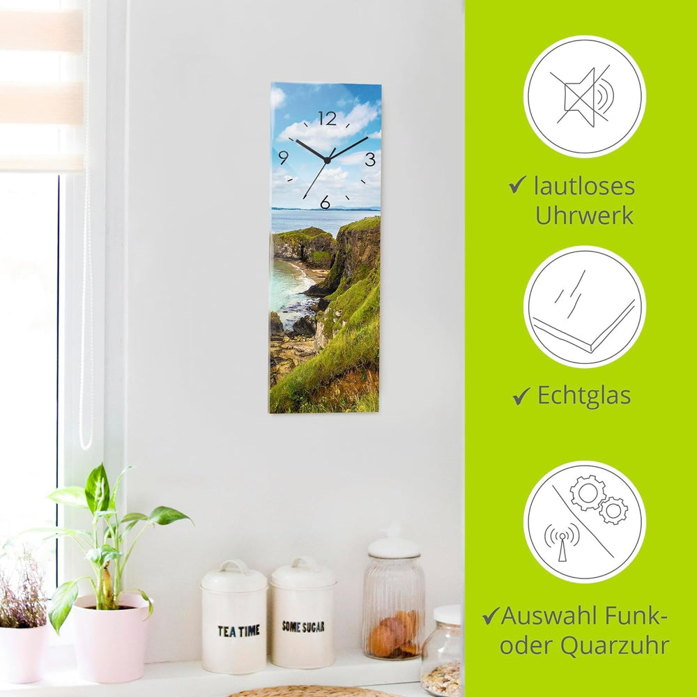 ARTLAND Wanduhr ohne Tickgeräusche Glas Quarzuhr 20x60 cm Rechteckig Lautlos Strand Küste Meer Felse