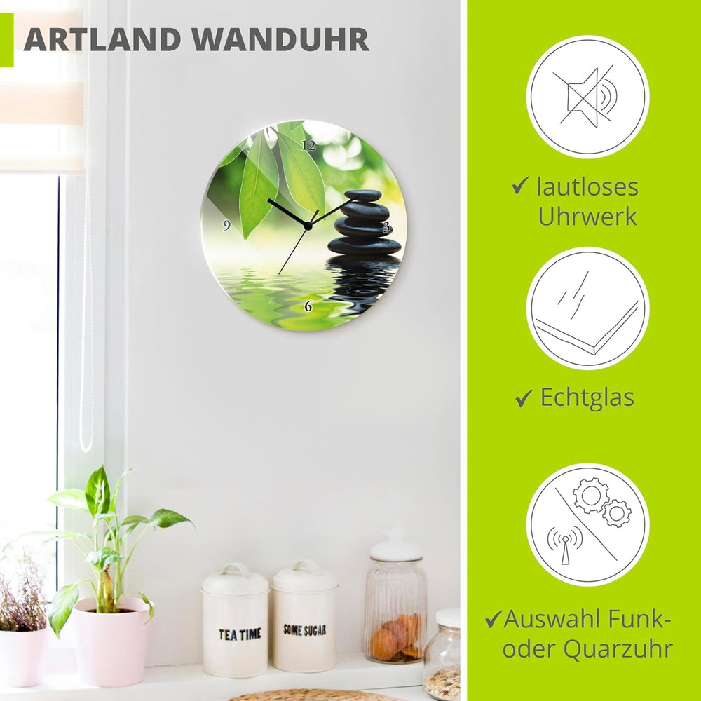ARTLAND Wanduhr ohne Tickgeräusche Glas Quarzuhr Ø 30 cm Rund Lautlos Zen Asiatisch Spa Steine See Y