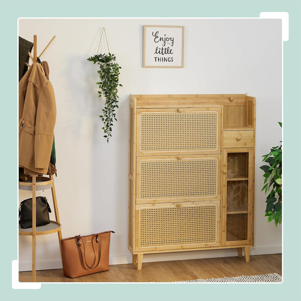 Relaxdays Schuhschrank, 5 Fächer, Bambus Schuhregal, 127x95x19 cm, für 9 Paar, 3 Klappen, schmaler S