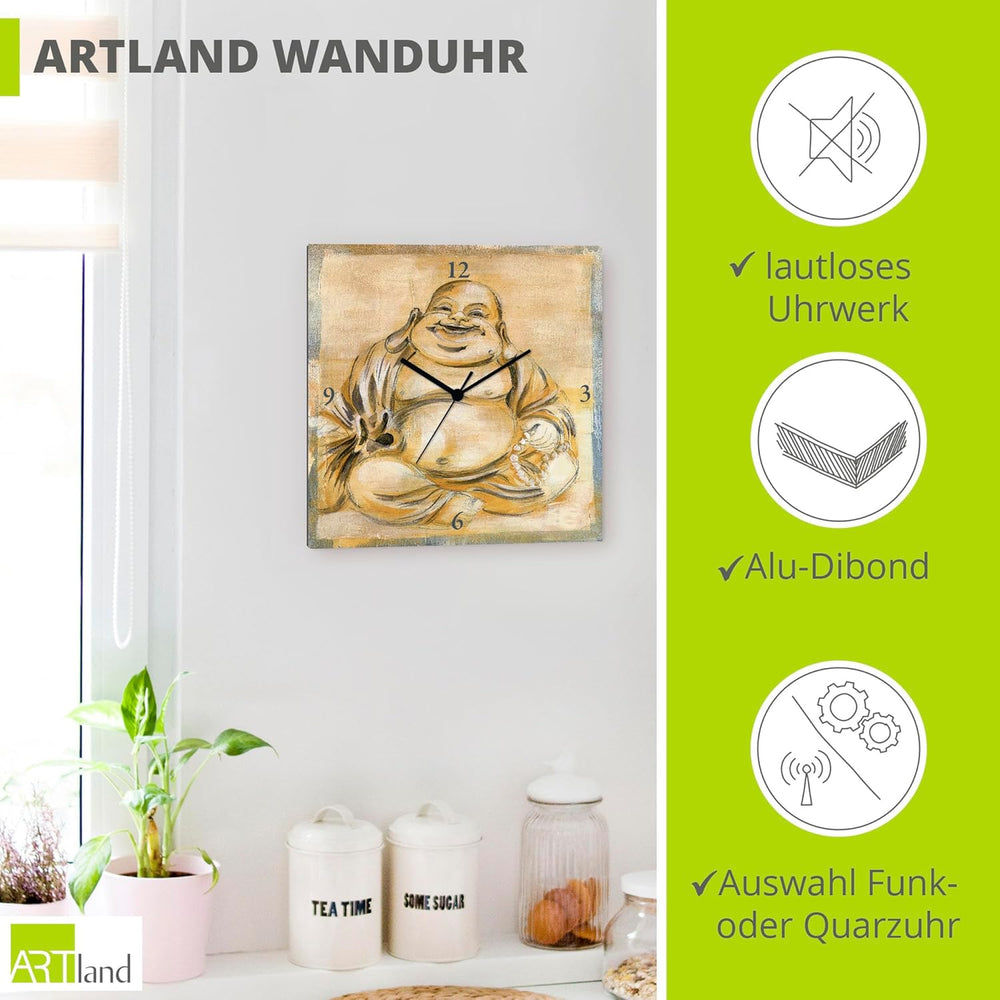 ARTLAND Wanduhr ohne Tickgeräusche Leinwand Quarzuhr 30x30 cm Quadratisch Lautlos Buddha Asien Buddh