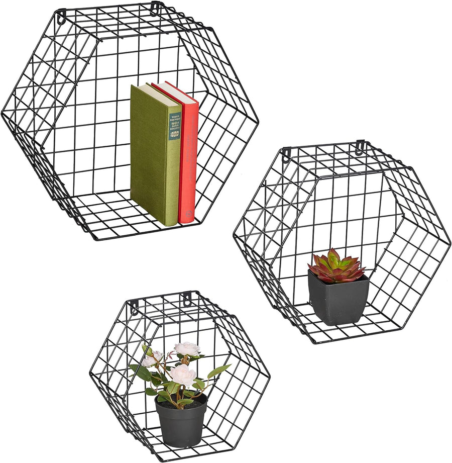 Relaxdays Wandregal 3er Set, Metall, 3 Grössen, Gitter-Design, Industrial, Hängeregal Hexagon, Dekor
