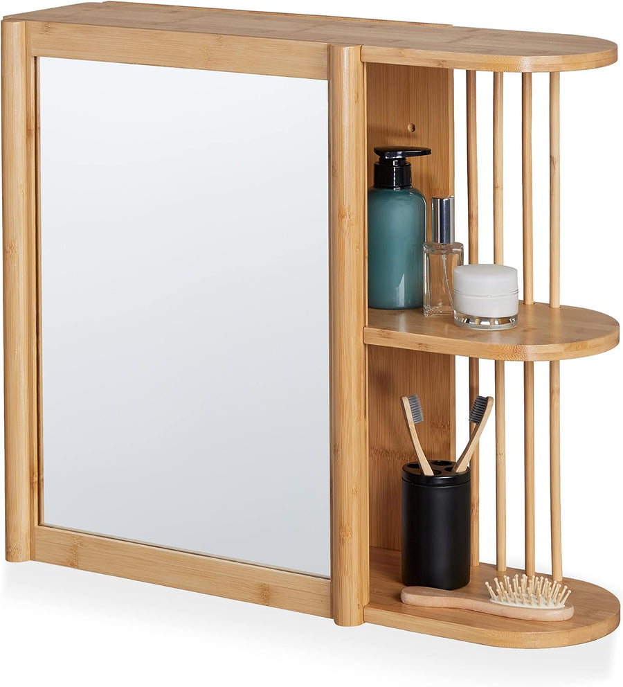 Relaxdays Wandregal mit Spiegel, Bambus, 2 halboffene Ablagen, 53x62x20 cm, Badezimmer, hängend, Spi