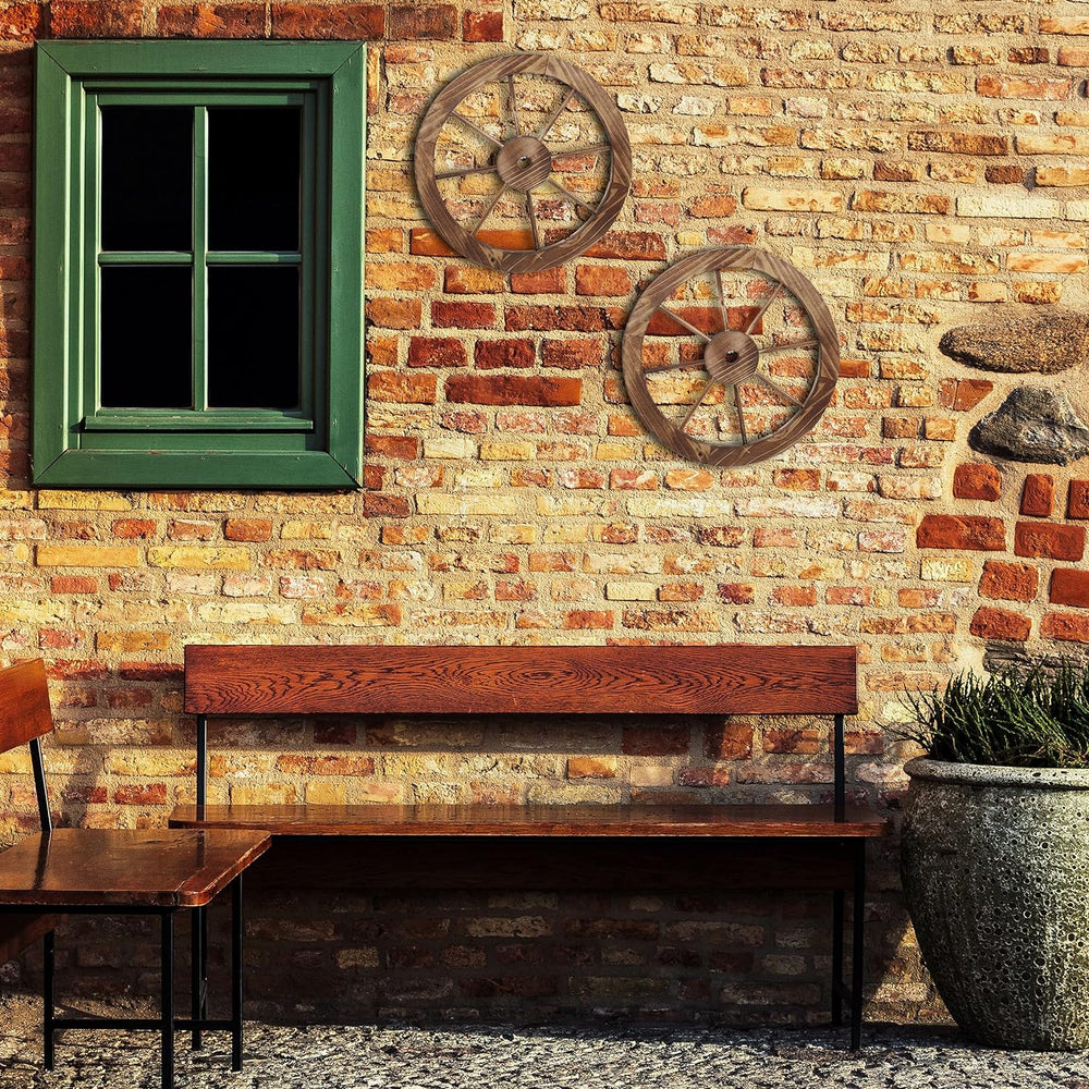 Relaxdays Wagenrad aus Holz, 2er Set, Deko für Garten, Terrasse, Veranda, rustikales Speichenrad, Sa