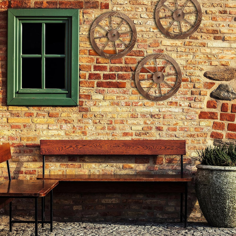 Relaxdays Wagenrad Holz, 3er Set, Deko für Garten, Terrasse, Veranda, rustikales Kutschenrad, Saloon