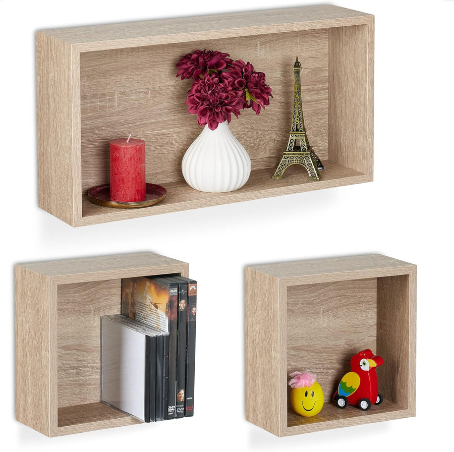 Relaxdays Wandregal Würfel, 3er Set, Schweberegal Holzoptik, 2 Grössen, rechteckig & quadratisch, Wü