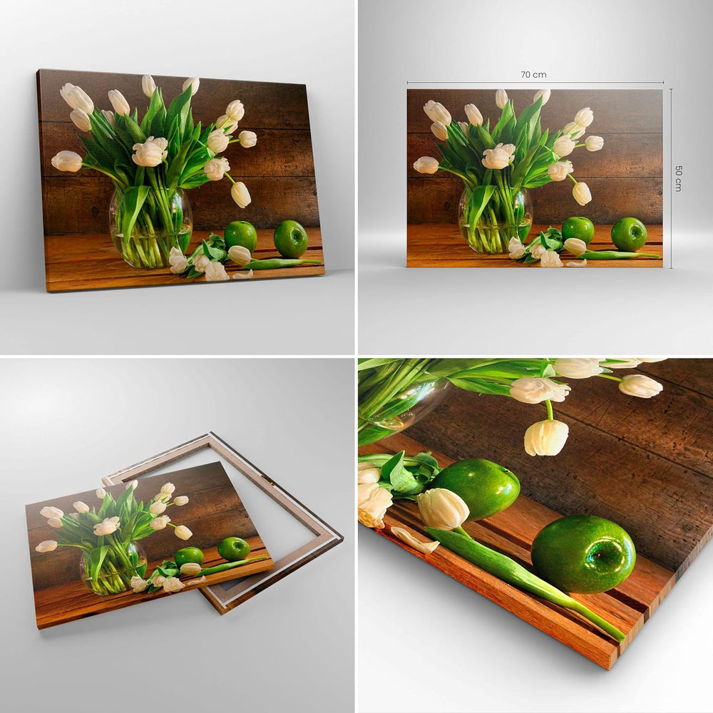Bilder auf Leinwand Tulpen Apfel Blumenstrauss Frühling Leinwandbild 70x50cm Wandbilder Dekoration W