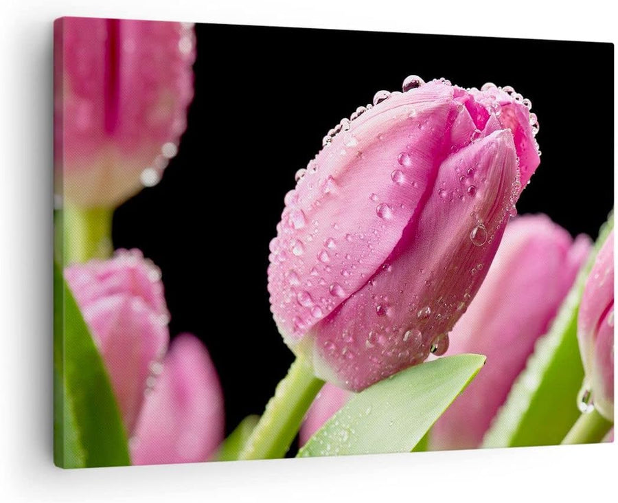 Bilder auf Leinwand Tulpe Blumen Tau Leinwandbild mit Rahmen 70x50cm Wandbilder Dekoration Wohnzimme
