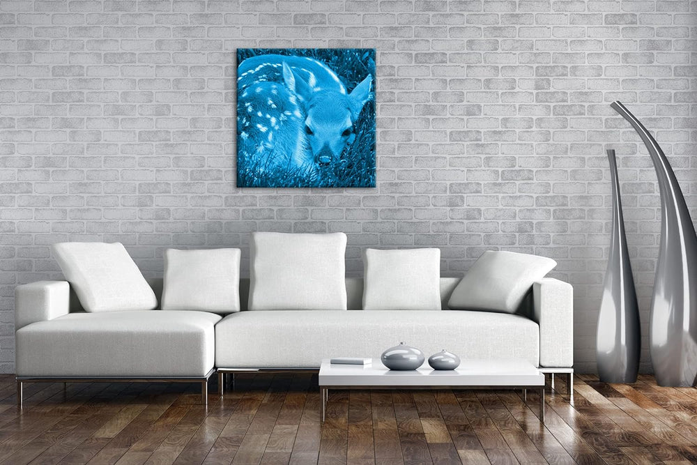 deyoli goldiges Rehkitz im hohen Gras Format: 70x70 Effekt: Monocrome Blau als Leinwandbild, Motiv f