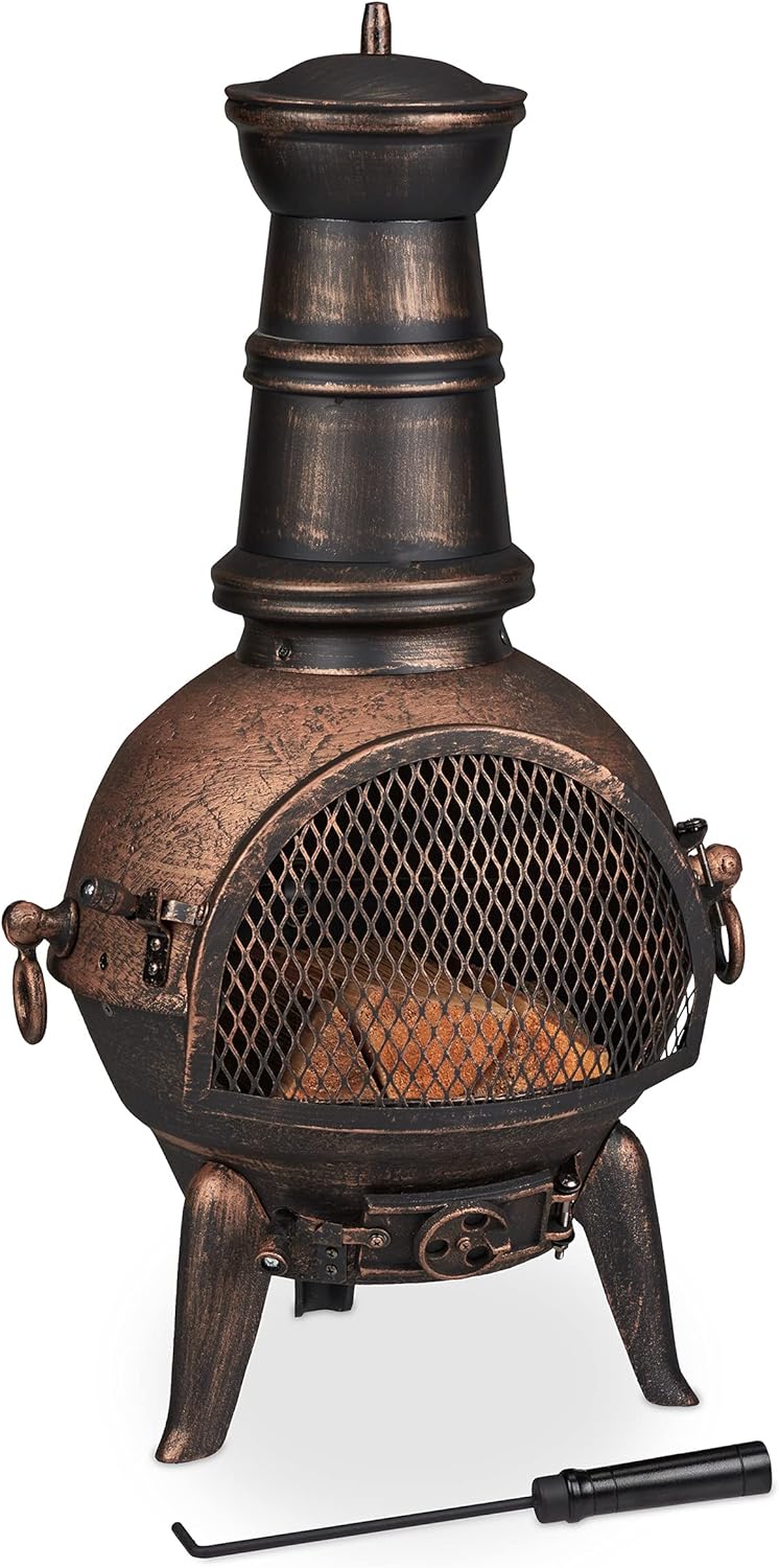 Relaxdays Terrassenofen mit Funkenschutz Tür, dekorative Feuerstelle für Holz, Gartenofen, HxD: 120x